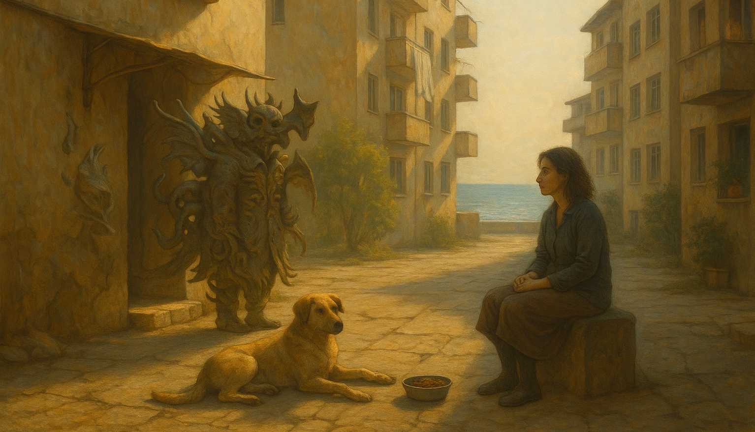 С полудня до четырёх, если сидеть под балконами, собачий боженька посылает Бэлле чего-нибудь из еды. Сухим кормом Бэлла не интересуется, но так уж у нас повелось: я выхожу из подъезда, ставлю на асфальт пластиковый контейнер с чаппи для стерилизованных собак и сажусь в солнечный квадрат рядом с Бэллой.